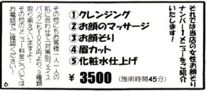 クレンジング → フェイスマッサージ → お顔そり → まゆカット → 化粧水仕上げ